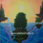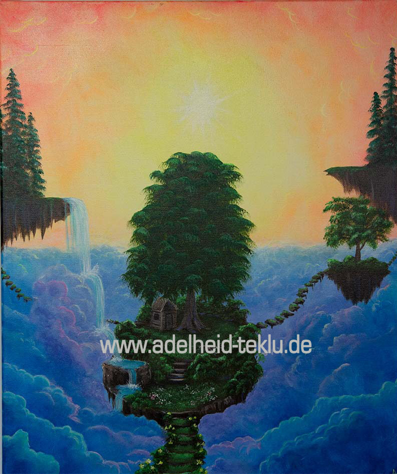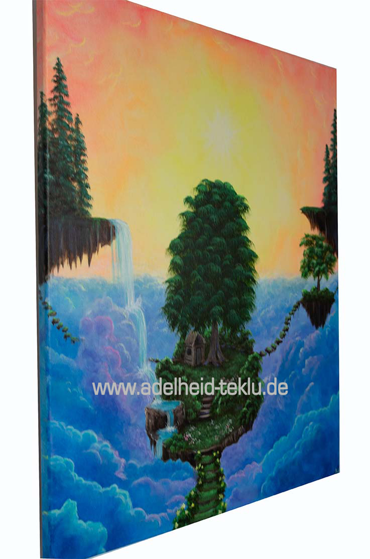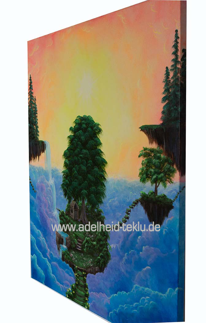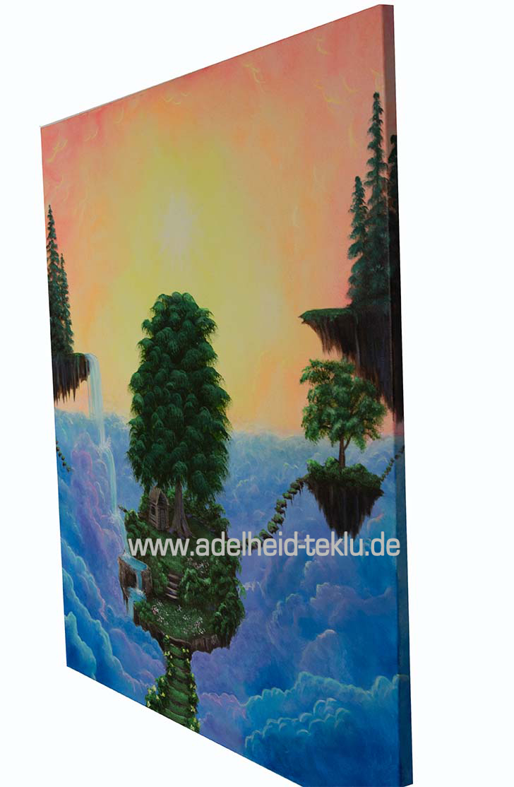 Dieses Gemälde entführt in eine träumerische Welt über den Wolken. Schwebende Inseln, verbunden durch kleine Pfade und Stufen, laden dazu ein, den Blick schweifen zu lassen und immer neue Details zu entdecken.