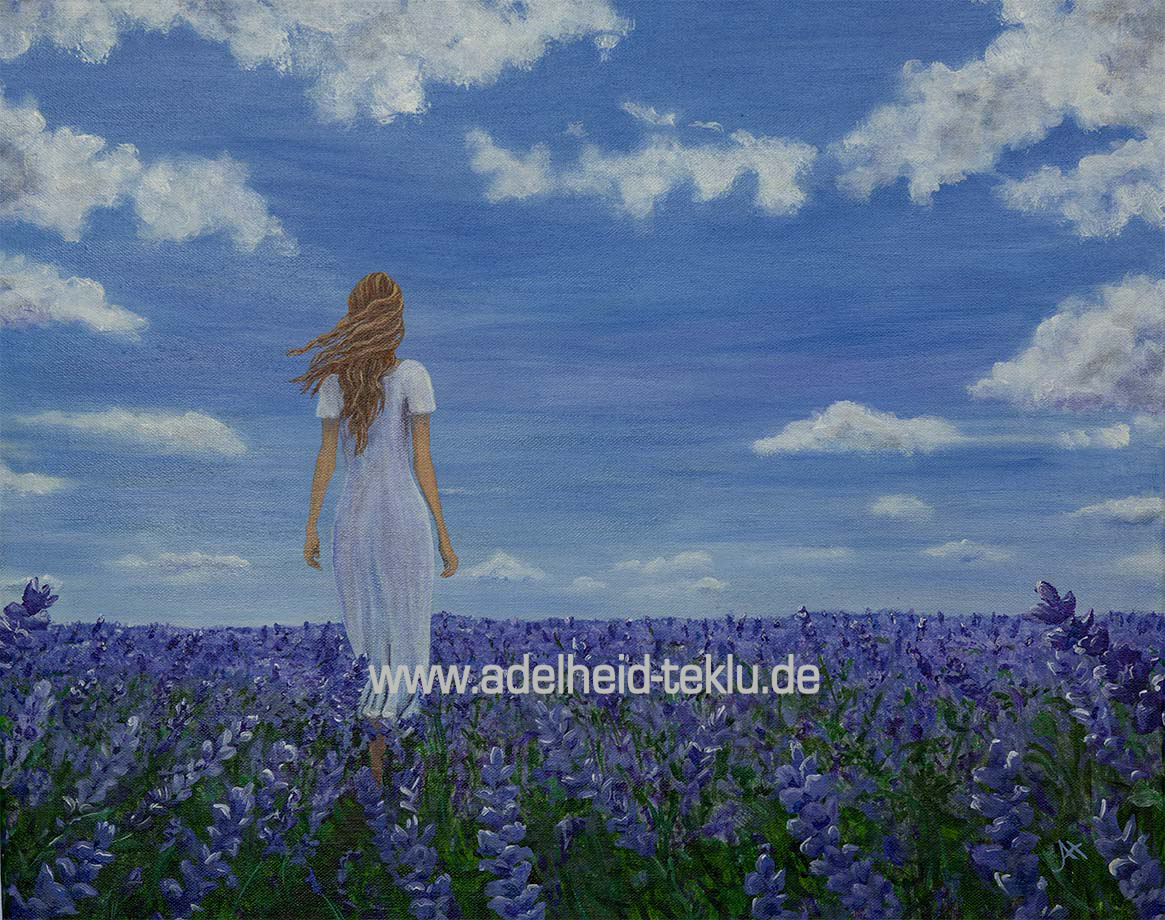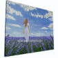 Ein weiter Blick über ein blühendes Lavendelfeld; ruhig und doch voller sanfter Bewegung. Eine junge Frau geht ihren Weg, getragen von der Weite des Himmels und der leisen Schönheit der Natur.