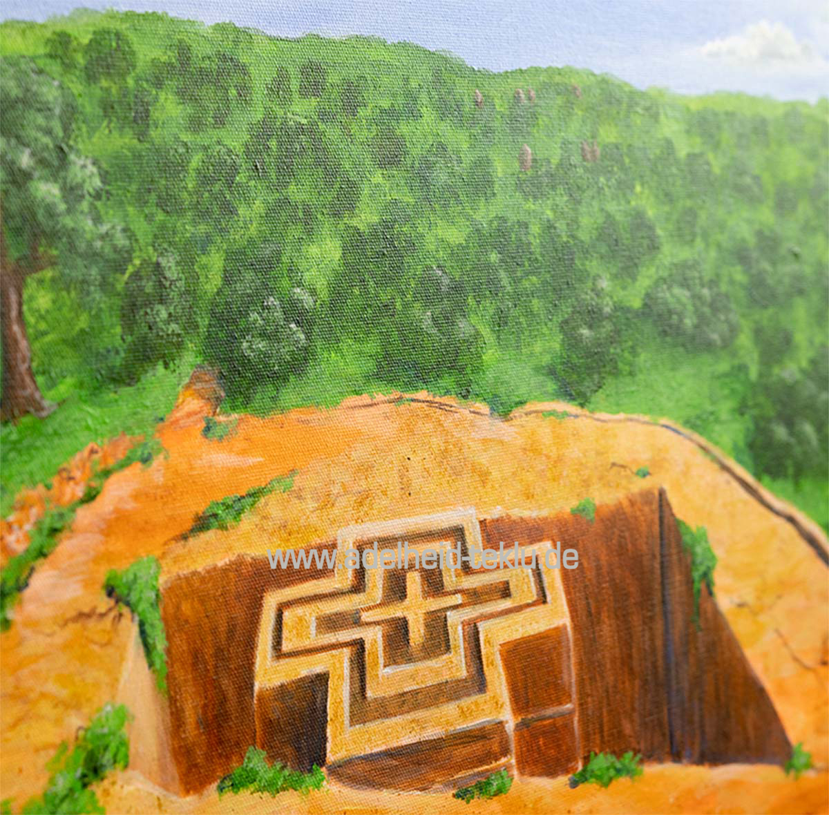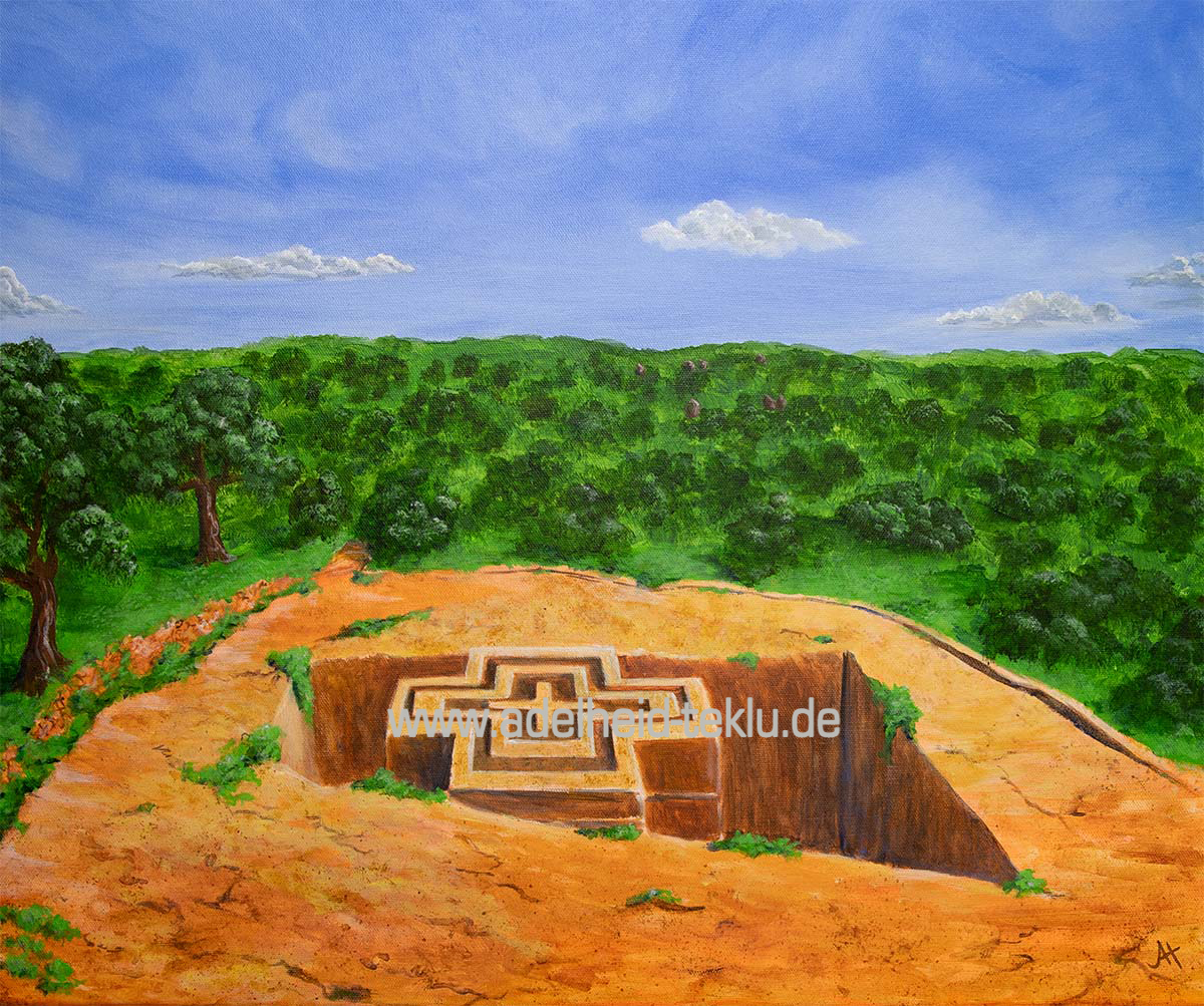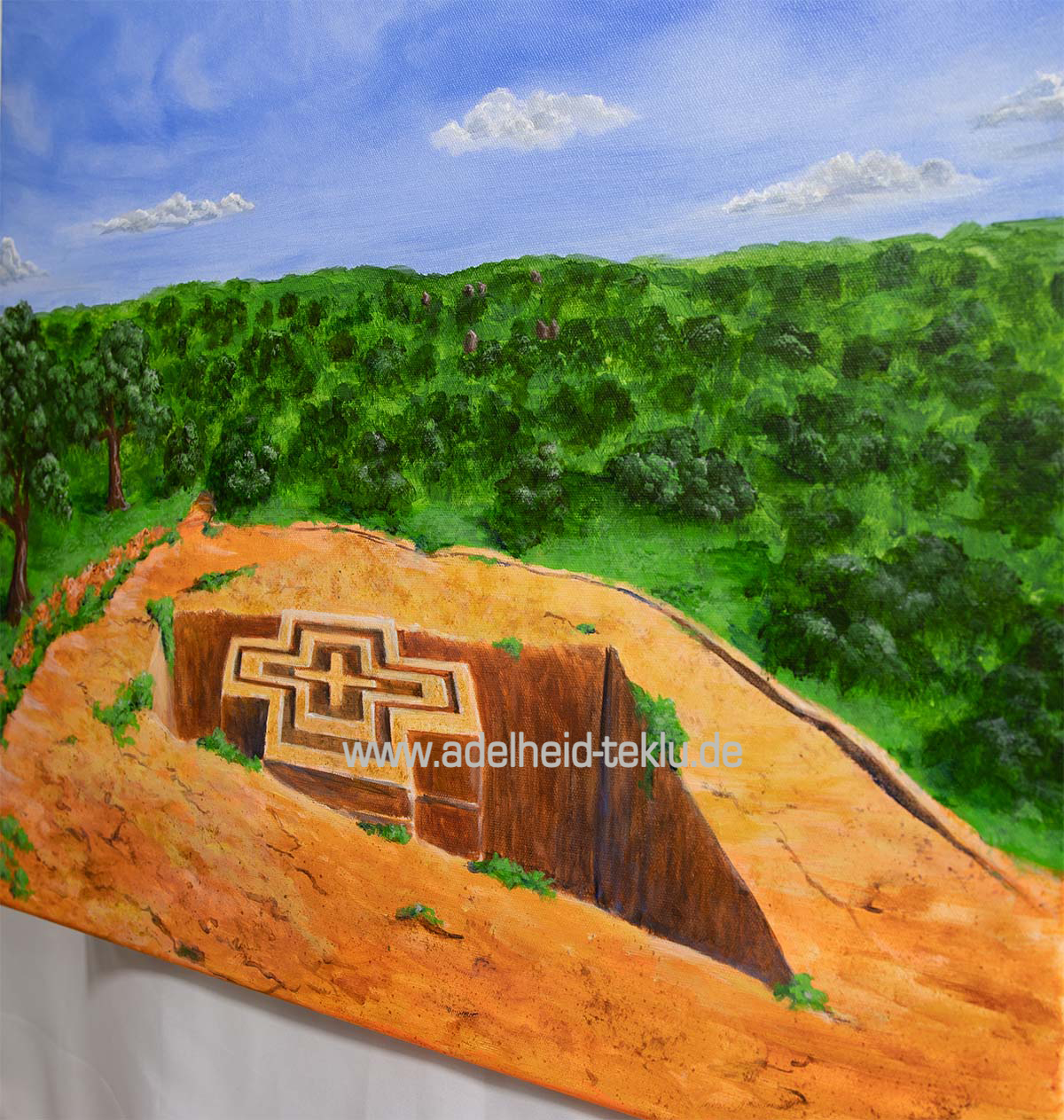 Dieses Gemälde zeigt eine der elf Felsenkirchen in Lalibela, Äthiopien. Sie wurden im 12./13. Jahrhundert direkt in den Felsen gehauen und sind auch heute noch aktive Gottesdienstorte.