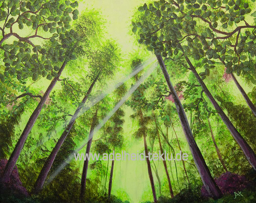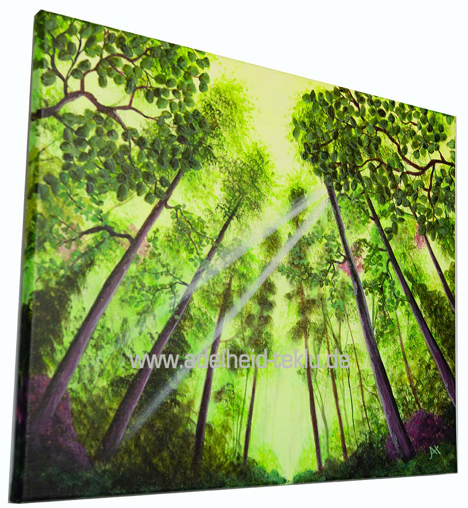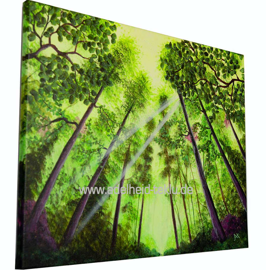 „Sonnenstrahlen im Wald“ ist ein handgemaltes Unikat, das die Schönheit der Natur dynamisch einfängt. Der Blick nach oben zieht die Aufmerksamkeit auf sich und die Lichtstrahlen sind ein klares Highlight. Der Betrachter hat das Gefühl, mitten im Wald und gleichzeitig unter dem Himmel zu stehen.